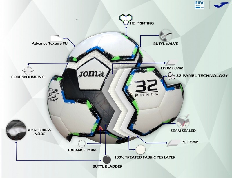 Футзальний м'яч. FIFA QUALITY PRO Розробка: Joma (Іспанія). Виробництво: Пакистан Окружність: 62.5 - 63.5 см. Тиск: 0.6 BAR - 0.8 BAR. Кількість панелей: 32 панелі Матеріал камери: Бутіл + поліуретанова піна. Розмір: 62 см. Вага: 410-430 г. Характеристика: Рекомендується для тренувань та ігор. Матеріал: 20% Поліуретан 20% Пінополіуретан 40% TPU 20% Поліестер. М'який на дотик 2 мм. поліуретан з підкладкою в 1,8 з спіненого EVA, що робить м'яч міцним і м'яким Блискуча глянсова поверхня з конструкцією в 32 панелі, що дозволяє досягти оптимального аеродинамічного контролю. Шов виконаний за класичною технологією ручної зшивки і при цьому використовувалася 5-шарова нитка, що забезпечує міцний шов та довгу службу м'яча. Підкладка: Підкладка з 4 шарів зроблена з полі-бавовни (Lining System - 65/35). Завдяки такій великій кількості шарів підкладки збільшується міцність і м'якість м'яча. Камера: бутіл (завдяки бутилу м'яч тримає набагато довше повітря, ніж латекс) М'яч зберігає свою форму та вагу за будь-яких погодних умов, навіть у дощ та сніг. У нас ви придбаєте лише оригінальні м'ячі. Ми цінуємо свою репутацію! Про бренд Joma: Іспанський бренд Joma виробляє професійне взуття, спортивну форму та аксесуари, такі як м'ячі. Зараз Joma консерн з виробництвом у США, Мексиці, Панамі, Гонг Конге, Італії, Німеччині, Англії та представництвами у 28 країнах. Компанія має власний науково-дослідний центр. Екіпірує національні збірні з футболу, наприклад, нашу, Збірної України. Якість та нові технології – основний підхід Joma до створення спортивних товарів!